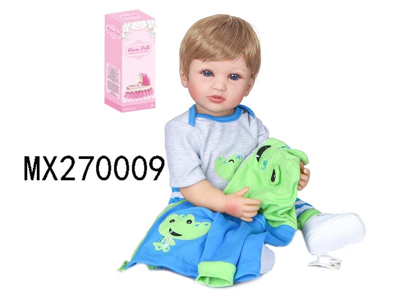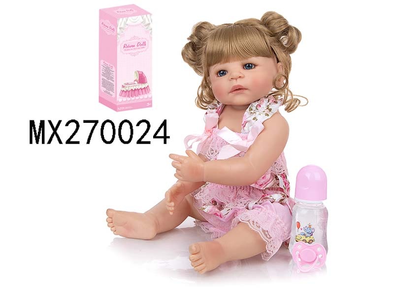 55厘米重生娃娃高仿真婴儿娃娃,(假发套)全身软胶,带奶瓶,磁性奶嘴,尿布,出生卡,运动鞋,金棕发蓝眼
